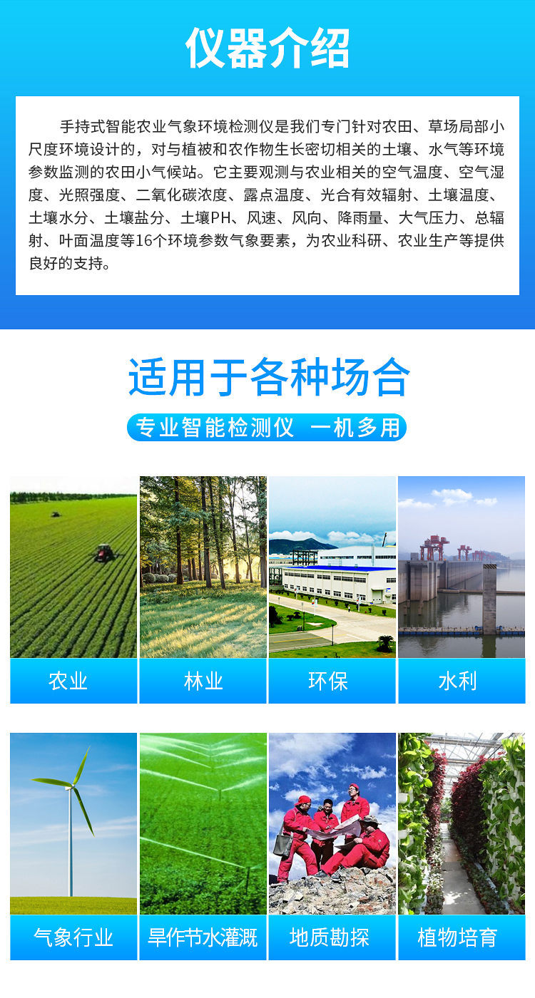便攜式氣象站是我們專門針對農(nóng)田、草場局部小尺度環(huán)境設(shè)計(jì)的,對與植被和農(nóng)作物生長密切相關(guān)的土壤、水氣等環(huán)境參數(shù)監(jiān)測的農(nóng)田小氣候站。它主要觀測與農(nóng)業(yè)相關(guān)的空氣溫度、空氣濕度、光照強(qiáng)度、二氧化碳濃度、露點(diǎn)溫度、光合有效輻射、土壤溫度、土壤水分、土壤鹽分、土壤PH、風(fēng)速、風(fēng)向等12個環(huán)境參數(shù)氣象要素,為農(nóng)業(yè)科研、農(nóng)業(yè)生產(chǎn)等提供良好的支持。