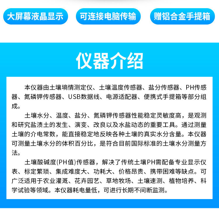 HM-TPH智能土壤PH測定儀采用一體化結(jié)構(gòu)設(shè)計,外置SD卡,主機可以實時采集被測環(huán)境土壤的溫度、水分、鹽分、PH等多個參數(shù),一鍵上傳數(shù)據(jù)等。