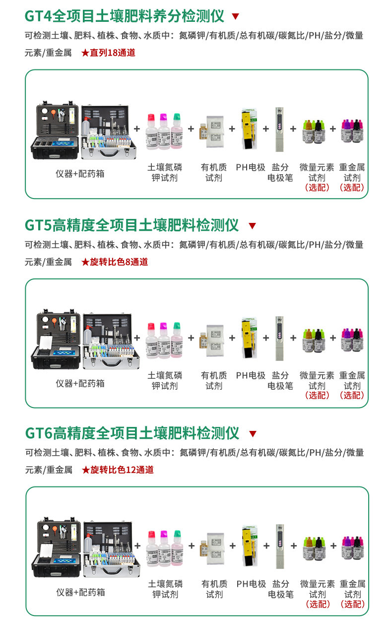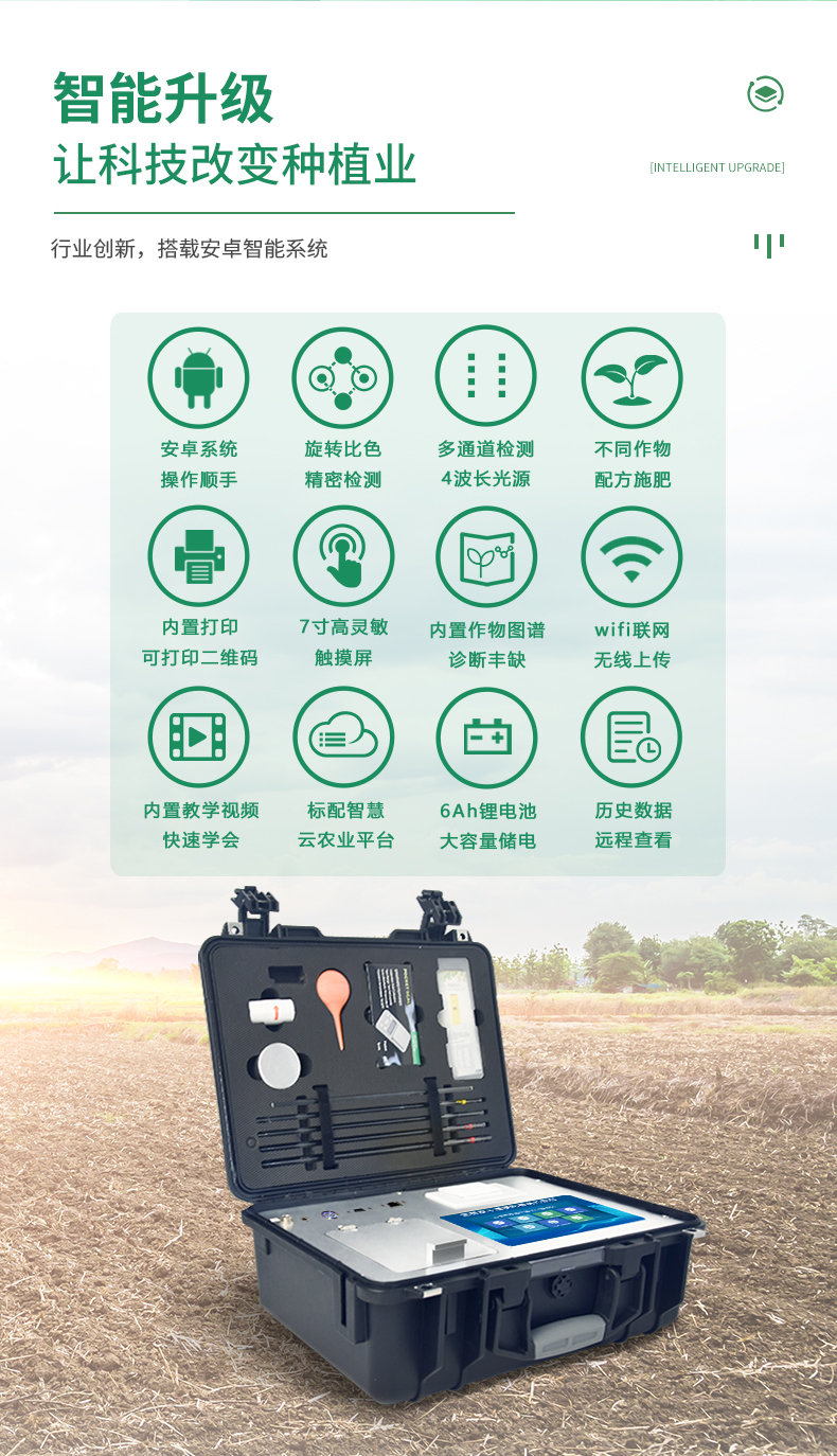 配套齊全:該儀器集藥、器、儀為一體,攜帶方便,相當(dāng)于一個小型移動實驗室,無需用戶自配附件,亦可靈活野外流動測試。適于農(nóng)業(yè)服務(wù)部門或農(nóng)資經(jīng)銷商、高教院校、科研院所、合作社、肥料廠商、大種植戶測土施肥和鑒別肥料真假及環(huán)保檢測應(yīng)用。