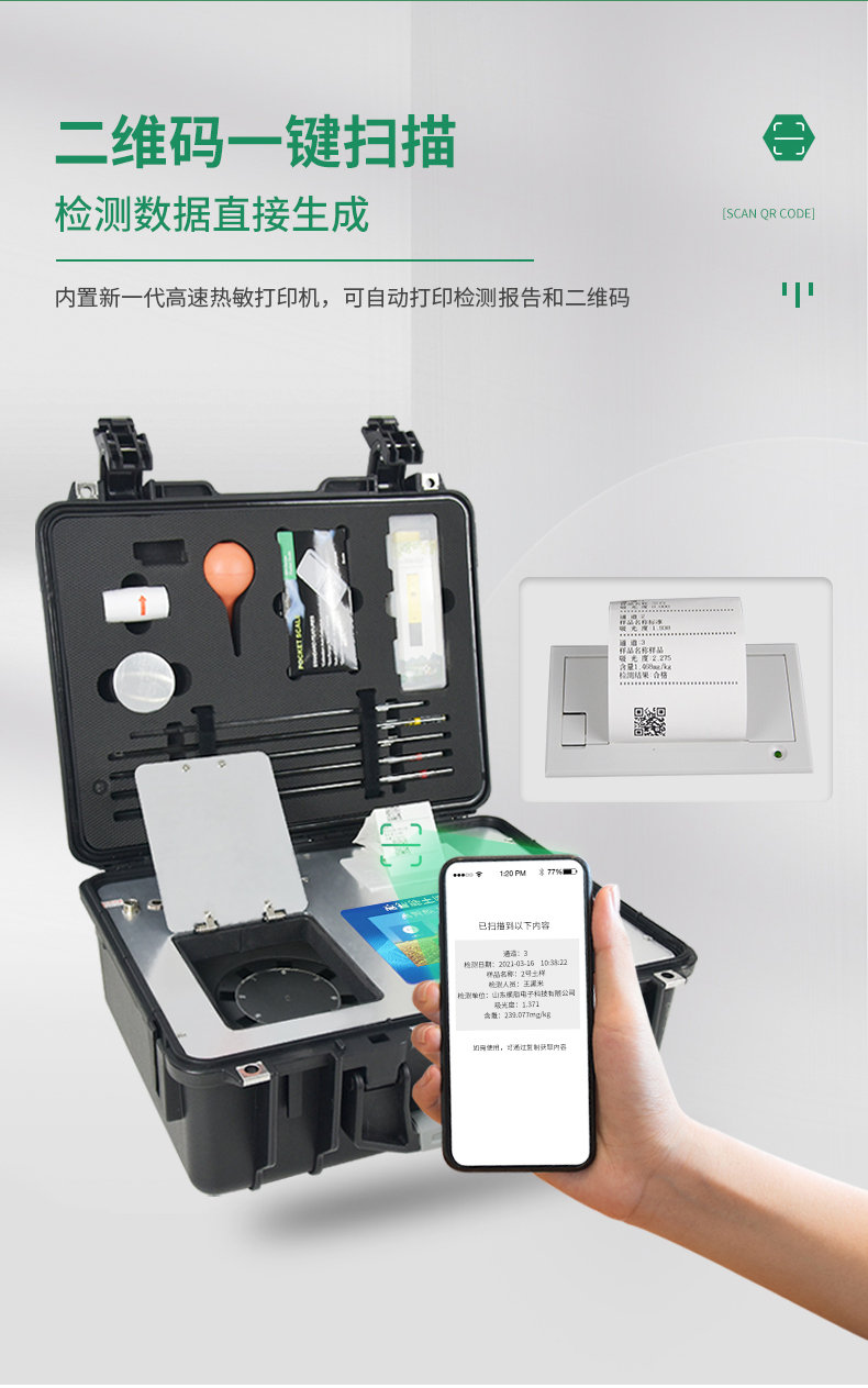 14、內(nèi)置新一代高速熱敏打印機(無需色帶),打印內(nèi)容包含:檢測單位、檢測人員、檢測項目、通道號、吸光度、養(yǎng)分含量(mg/kg)、檢測時間、以及二維碼等信息