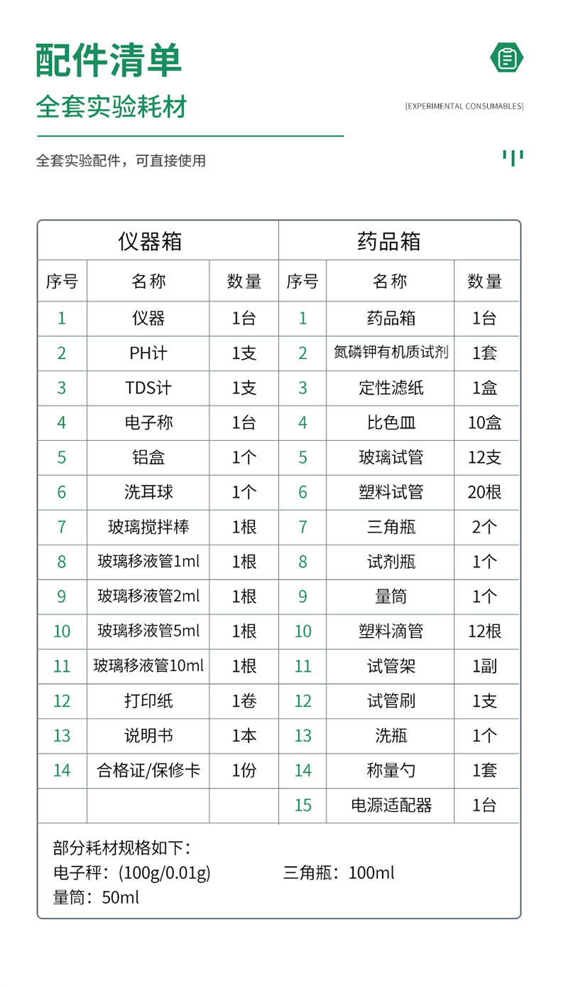 | 2 | PH計 | 1支 | 2 | 氮磷鉀有機質(zhì)試劑 | 1套 |