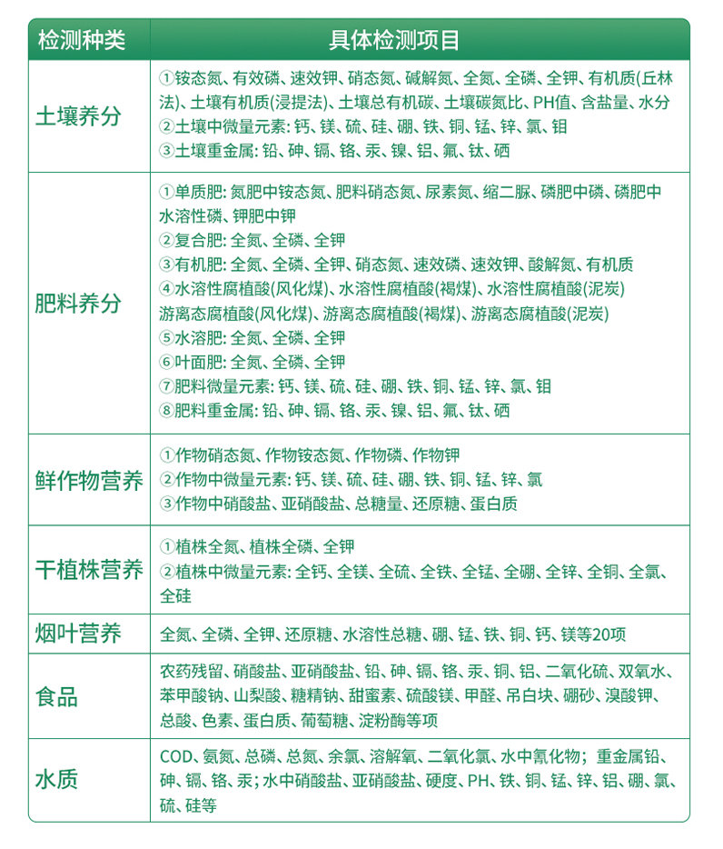2、肥料養(yǎng)分:●單質(zhì)肥:氮肥中銨態(tài)氮、肥料硝態(tài)氮、尿素氮、縮二脲、磷肥中磷、磷肥中水溶性磷、鉀肥中鉀;●復(fù)合肥全氮、復(fù)合肥全磷、復(fù)合肥全鉀;●有機肥全氮、有機肥全磷、有機肥全鉀、有機肥硝態(tài)氮、有機肥速效磷、有機肥速效鉀、有機肥酸解氮、有機質(zhì);●水溶性腐植酸(風(fēng)化煤)、水溶性腐植酸(褐煤)、水溶性腐植酸(泥炭)、游離態(tài)腐植酸(風(fēng)化煤)、游離態(tài)腐植酸(褐煤)、游離態(tài)腐植酸(泥炭);●水溶肥全氮、水溶肥全磷、水溶肥全鉀;●葉面肥全氮、葉面肥全磷、葉面肥全鉀;●各種肥料微量元素:肥料鈣、肥料鎂、肥料硫、肥料硅、肥料硼、肥料鐵、肥料銅、肥料錳、肥料鋅、肥料氯、肥料鉬;●肥料重金屬:肥料鉛、肥料砷、肥料鎘、肥料鉻、肥料汞、肥料鎳、肥料鋁、肥料氟、肥料鈦、肥料硒。